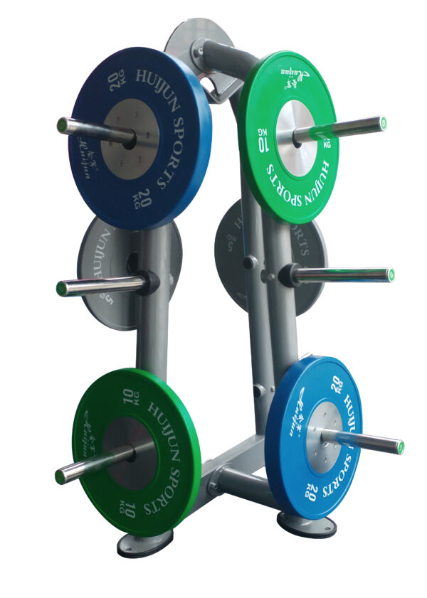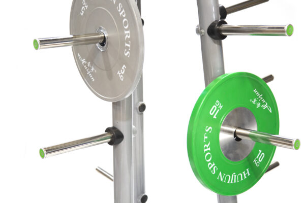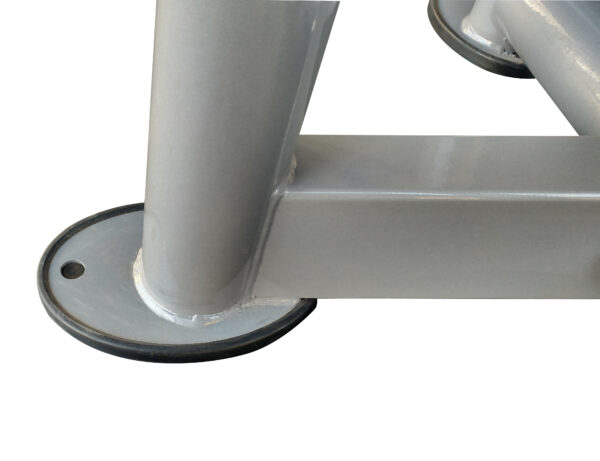 Estructura de acero, base de goma y perforaciones para amurar al suelo.